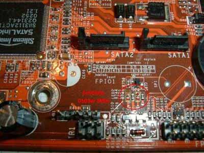 下面给出的例子中,使用的主板为升技的NF7-S Rev. 2,该主板原有的贴片LED如下图所示。另外特别提醒:这种改装较为复杂且危险度较高,同时一旦改装就意味着你的主板从此失去了质保!在你明确知道自己在做什么之后,仍要三思而后行。对用户所出现的任何损害,本文及其译者恕不负责。