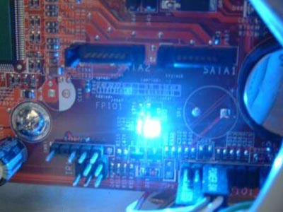 最好在焊接好一支LED后就立即外接电源进行测试,当然如果对自己有信心,也可以全焊好之后通电测试。大功告成之后,主板就会旧貌换新颜了: