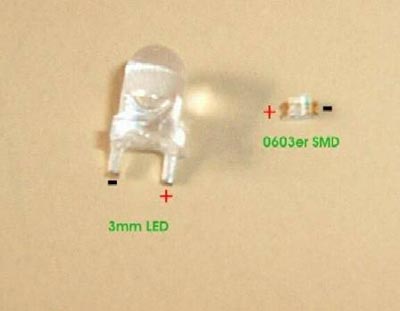 由于SMD元件体积极小,因此你需要有一只非常镇定的手才能完成焊接工作,另外还需要耐心和运气。如图中所示,SMD LED上标有绿色的一端代表负极。